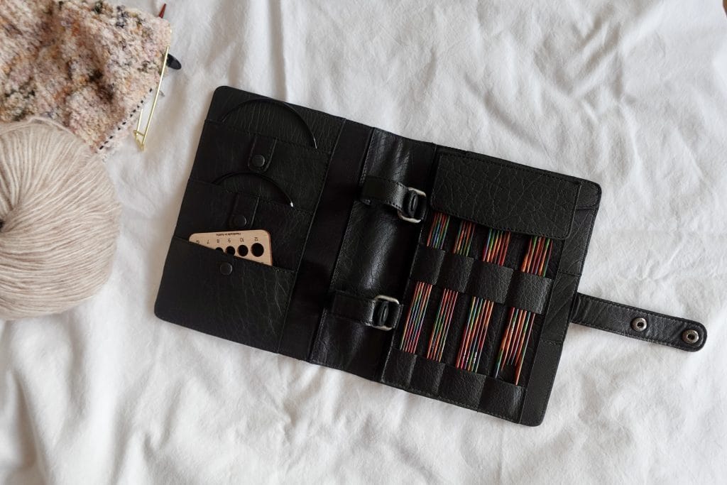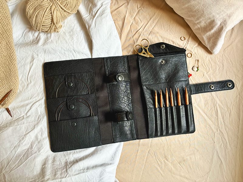 Für alle, die beim Stricken Ordnung schaffen wollen, ist das Carita Case genau das Richtige. Diese praktische Ledertasche hat ein durchdachtes Innenleben mit speziellen Taschen und Fächern für verschiedene Strickutensilien. In den Fächern können Sie Ihre Kabel ordnen, und das Etui bietet Platz für drei Sätze austauschbarer Nadeln sowie eine Tasche für Zubehör wie kleine Scheren, Maschenmarkierer oder Maßband. Es passt für Nadeln der Größen 2 mm bis 10 mm und das strapazierfähige Leder schützt Ihre Strickutensilien. In der Mitte kannst du verschiedene Einlagen hinzufügen und so dein Nadel-Etui an deine Bedürfnisse anpassen. Wir haben uns für das B- und C-Inlay entschieden, aber das Etui passt für mehrere der von muud angebotenen Inlays. Wir würden auf jeden Fall empfehlen, das Etui mit den Inlays zu kombinieren, denn das macht das Etui so besonders und ohne Inlays passen nur wenige Nadeln hinein.