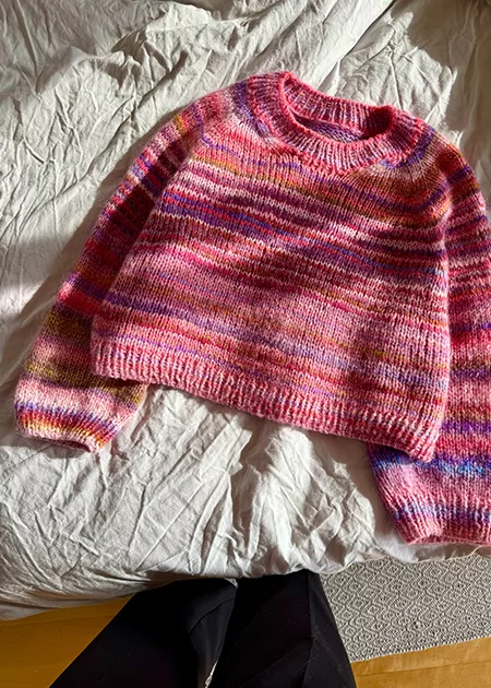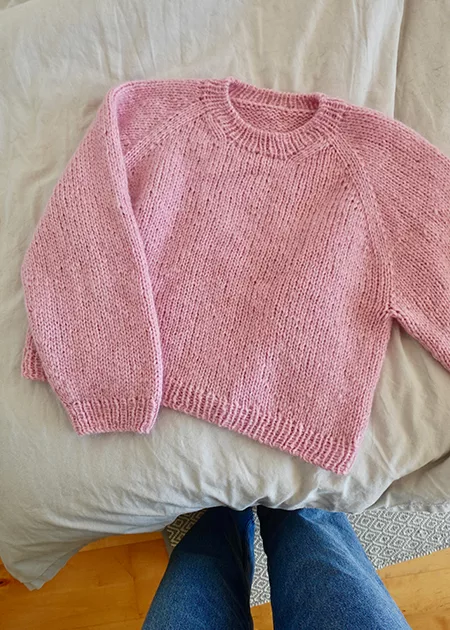 The Foolproof Sweater – your very first knitting project. Perfect for any beginner knitter who wants to learn how to create their own handmade garments with needles and yarn! This raglan sweater knitting pattern is worked seamlessly from the top down, making it easy to follow. After separating the sleeves, the body is knitted in the round. The 1×1 ribbed cuffs, hem, and neckline give the sweater a neat and professional finish.