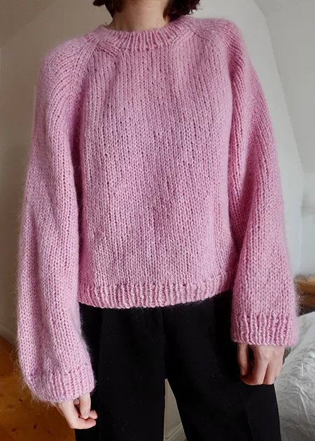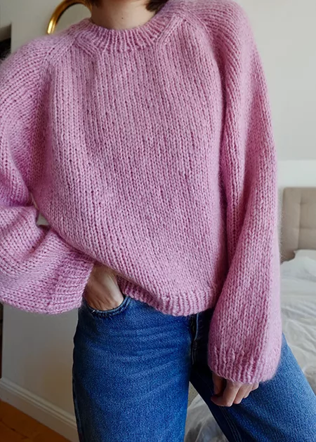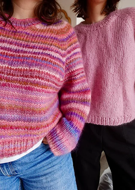 Our pink Foolproof Sweater was knit in: “Promise” (col. 009) and “Mohair Luxe” (col. 148) from Lang Yarns.