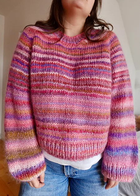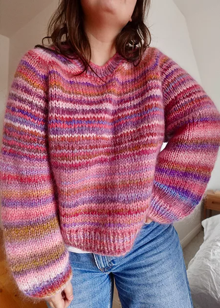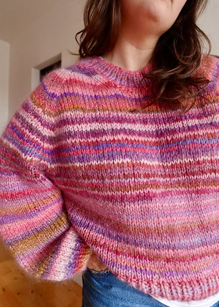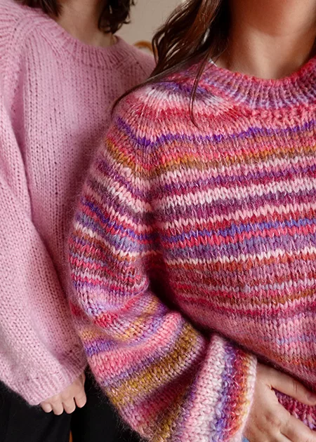 Our colorful Foolproof Sweater is knit in: “Cloud” (col. 003) and “Mohair Luxe” (col. 109) from Lang Yarns.